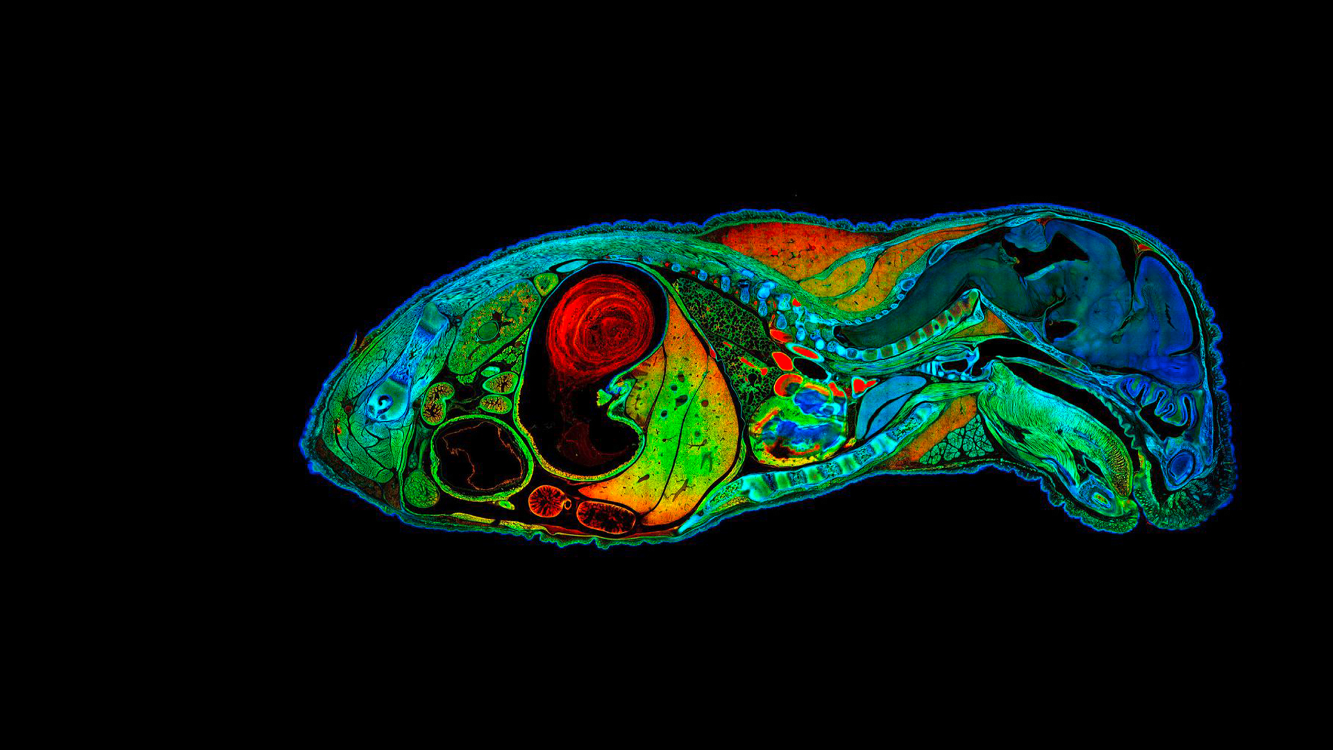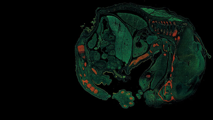 High resolution mouse embryo mosaic image of 722 tiles containing 190 Megapixels. FLIM data fitted with four characteristic fluorescence lifetimes, color coded. Acquisition: 1:23 h. Analysis: 1:00 h